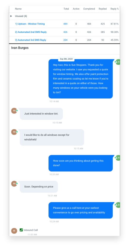 The top data shows one example of actual customer response rates to automated texting. As in the previous example, this text was also sent 5 minutes after Ivan submitted his information on the company website and he responded within 1 minute. The second text is automatically sent 5 minutes after he responds. In this particular example, the business would prefer to drive phone calls with the third automated text sent 3 minutes after the customer’s reply to the second text. From the response rate data, nearly 50% of the customers are calling the business.
