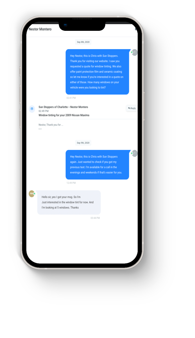 Ever struggled to keep up with all the calls, emails and texts your business receives in a day? Velocity CRM organizes all communication with each customer into one thread. In this example, the first text is an automated campaign followed by an email campaign sent to every customer only 5 minutes after they submit their information on the company website. If the customer does not respond to the first text, a follow-up text is also automated to be sent 22 hours later. In this case, the follow-up text is what the customer responded to and won the lead.